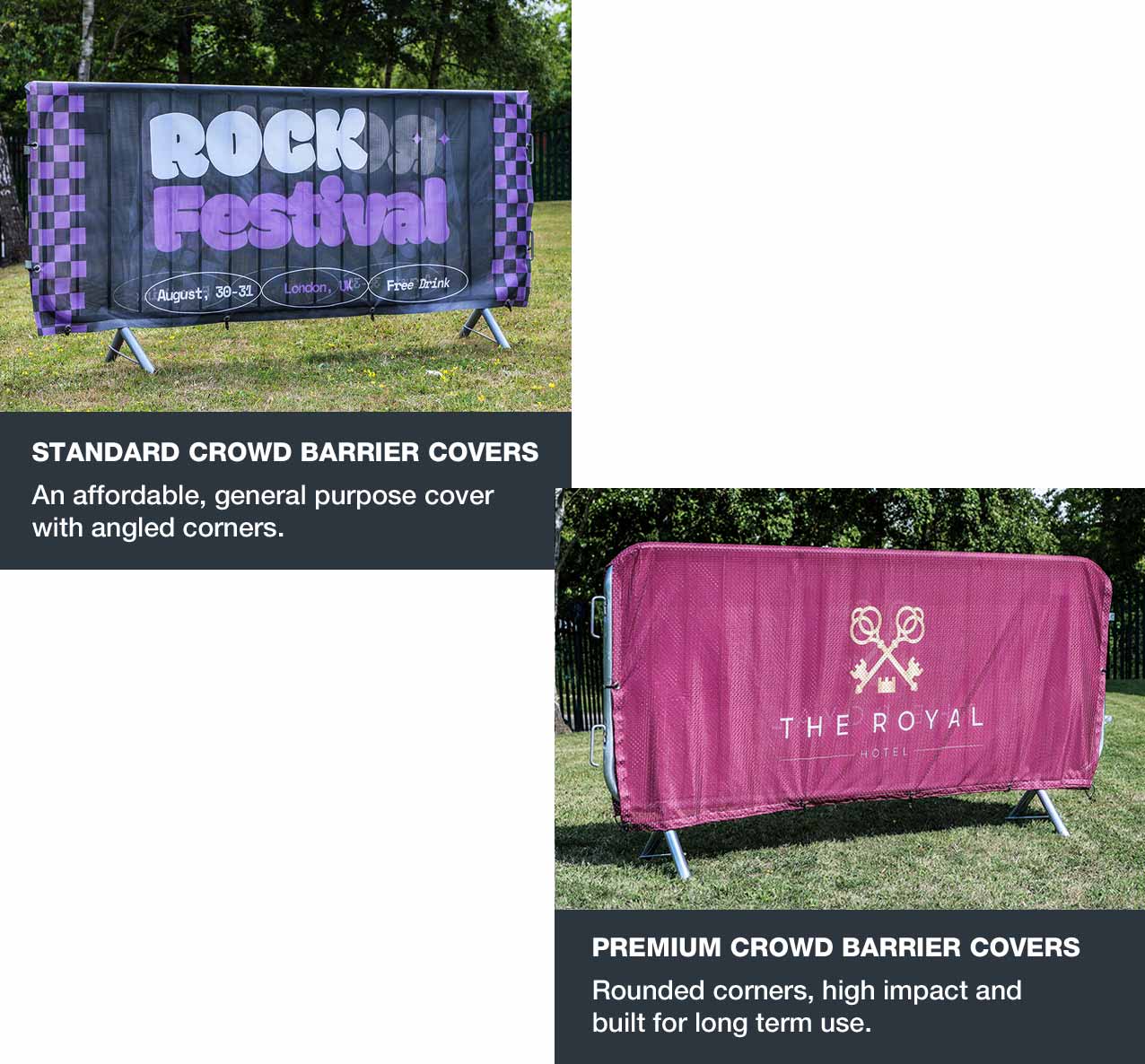 Ideal for festivals, events, concerts or any location where crowd control is needed, these covers offer an effective way to guide or separate attendees while capturing attention.